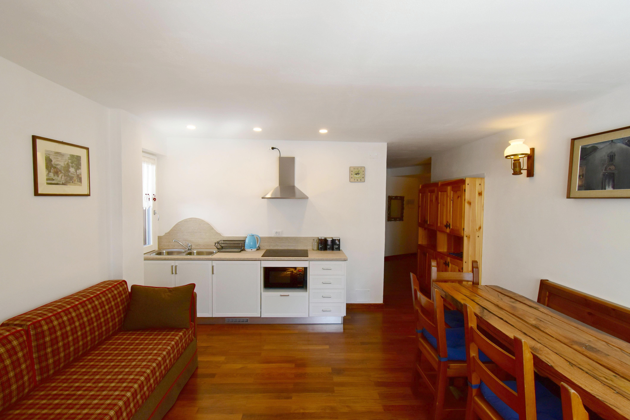 Appartamento 4/6 posti letto sito nella zona sud di Madonna di Campiglio a circa 130 mt dalla partenza della CABINOVIA COLARIN che porta direttamente sulle piste della 5 Laghi. Si compone di ingresso, stanza matrimoniale con bagno completo, 2° bagno (senza doccia) stanza con 2 lettini singoli, soggiorno con zona pranzo e divano letto singolo + letto estraibile, angolo cottura con forno a micronde e piastre ad induzione.