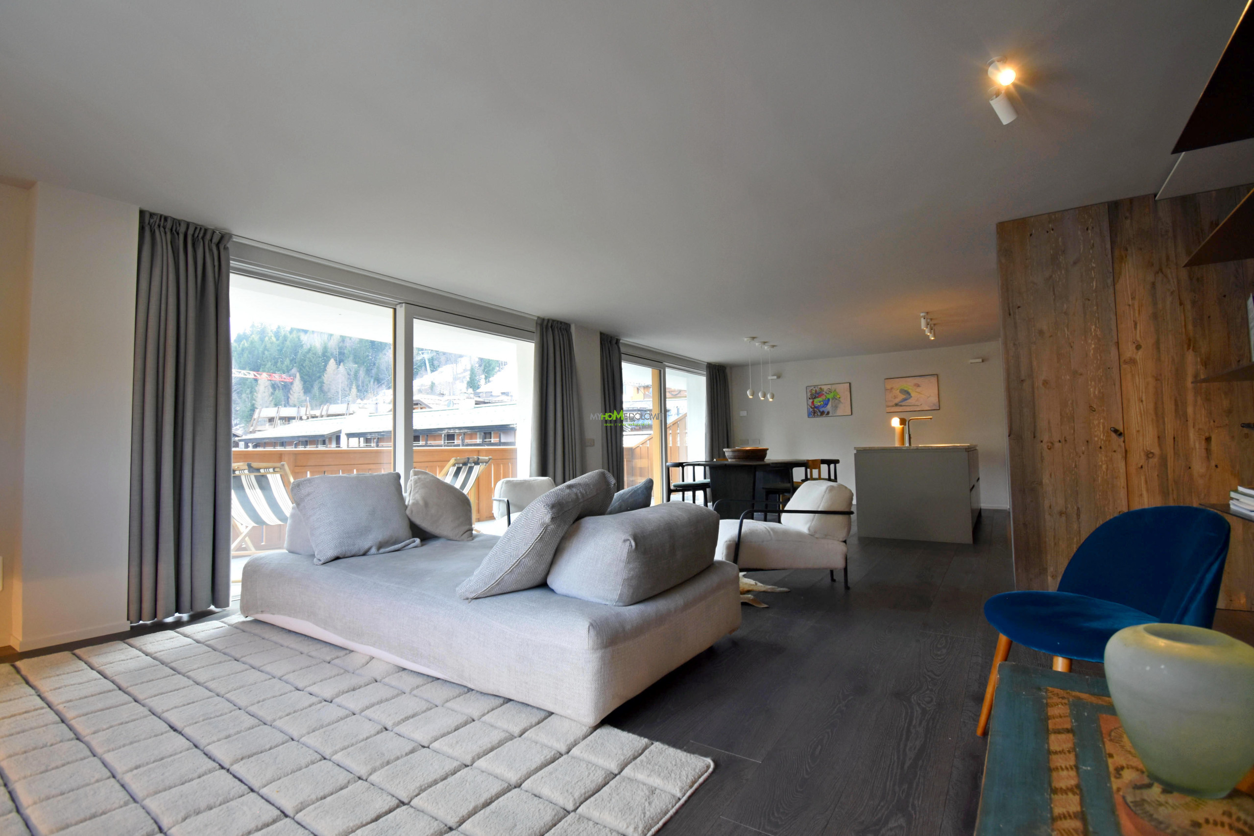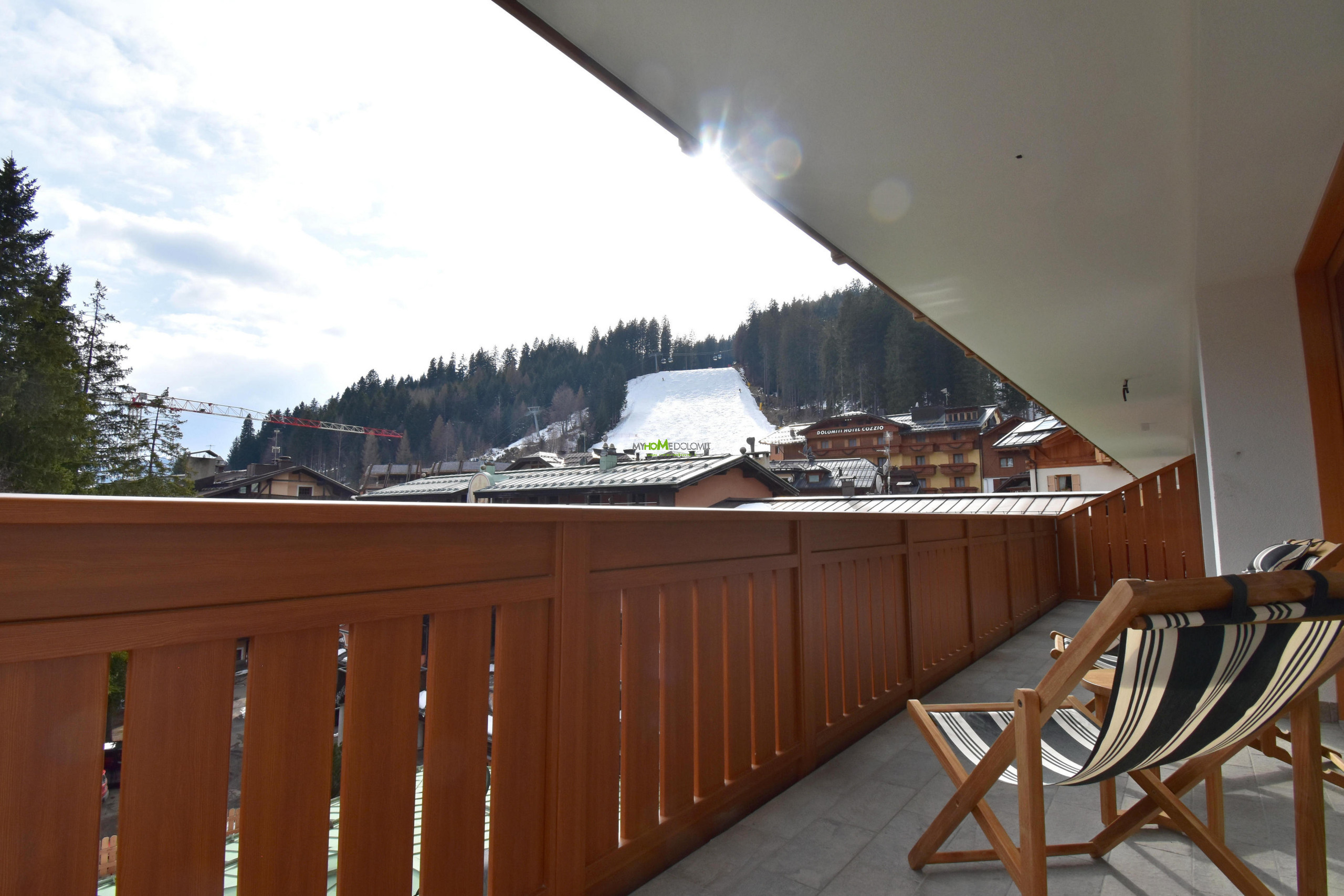 Il soggiorno si apre su un ampio terrazzo panoramico esposto a sud, dal quale si può godere della vista sui monti che circondano Madonna di Campiglio. È inoltre presente un secondo terrazzo, al quale è possibile accedere da una delle due camere.