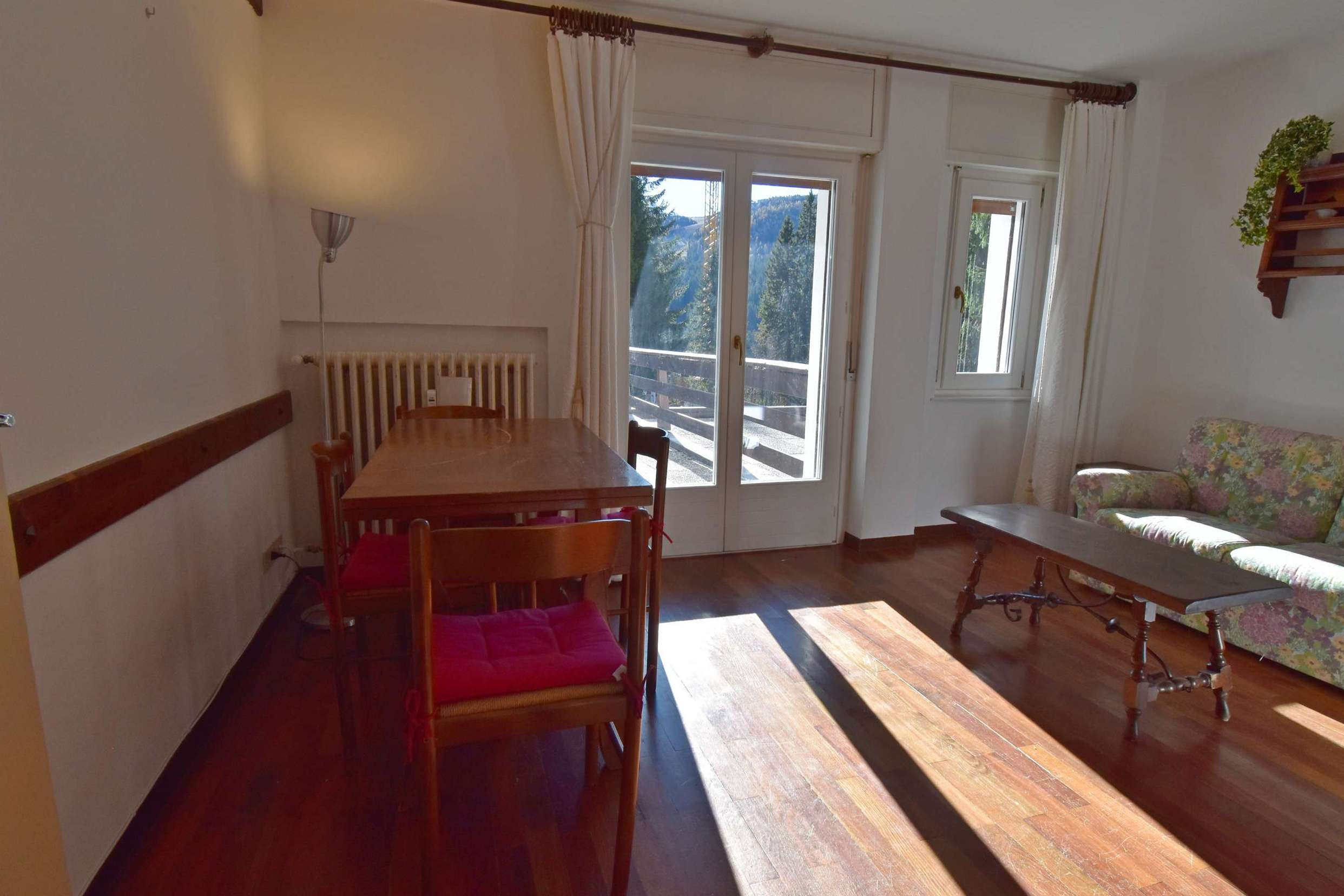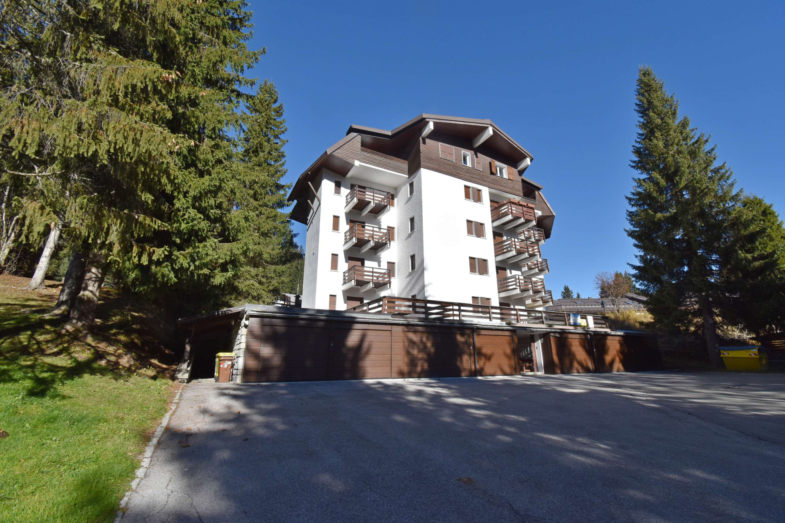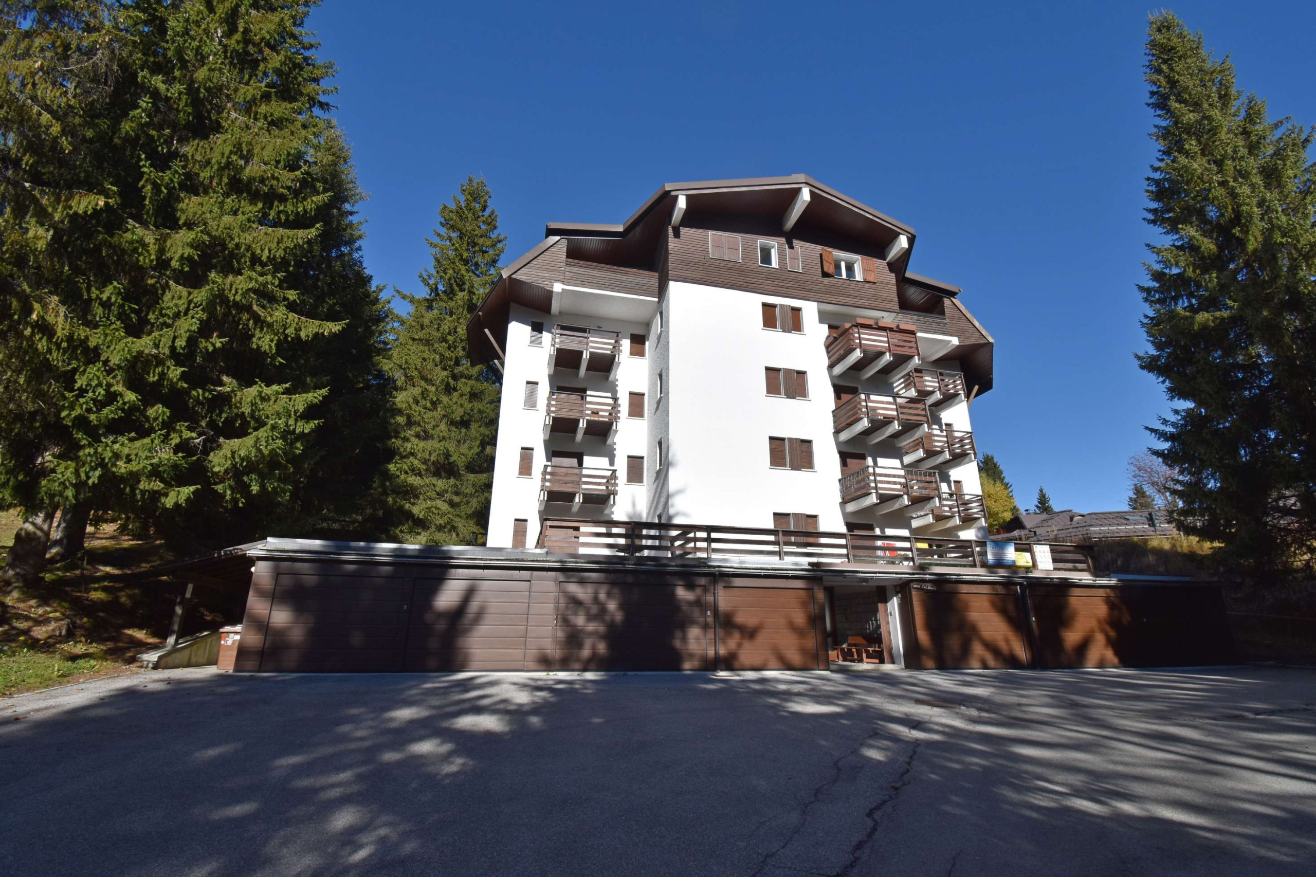 Appartamento situato al primo piano composto da ingresso, camera con letto a castello, camera con letto matrimoniale, bagno completo con finestra e doccia completamente ristrutturato, piccola cucina con finestra, piccolo soggiorno con divano e tavolo da pranzo, ampio e soleggiato balcone. Posto auto in garage e cantina per deposito sci. La posizione è molto tranquilla e comoda per lo sci, uscendo dal condominio a pochi passi si trova la pista che scende dalla malga Zeledria, inoltre a circa 150 mt. si trova il Mini Market di Campo Carlo Magno.