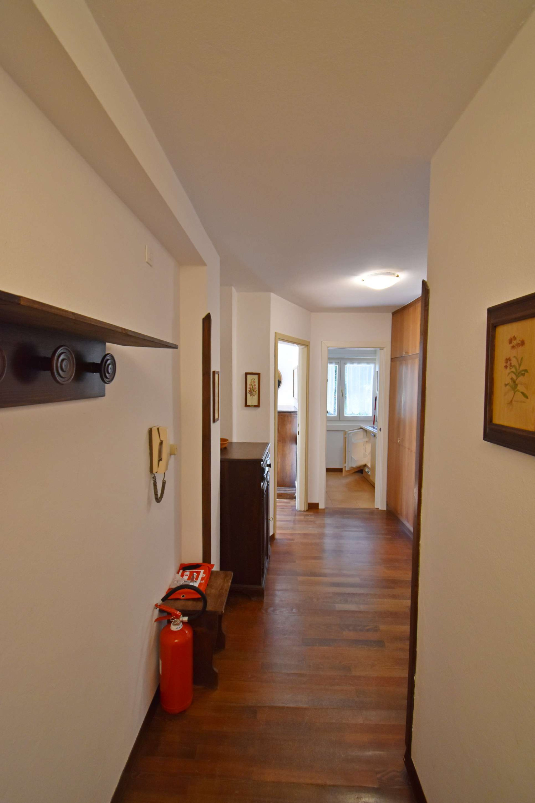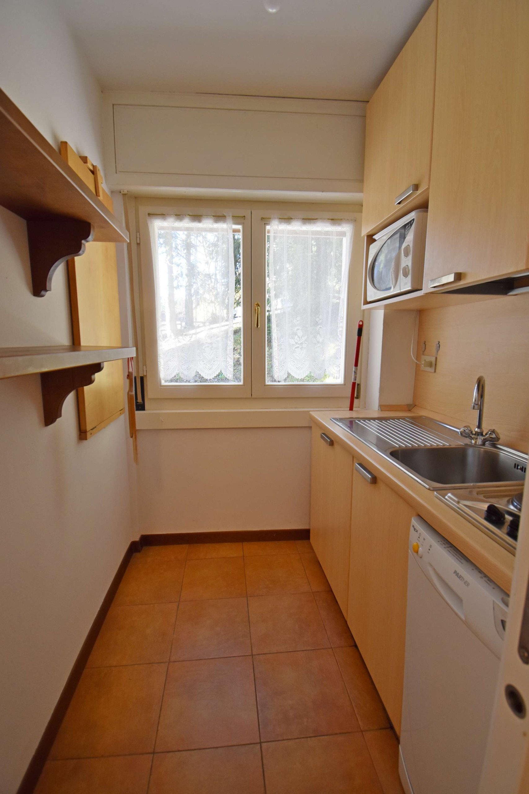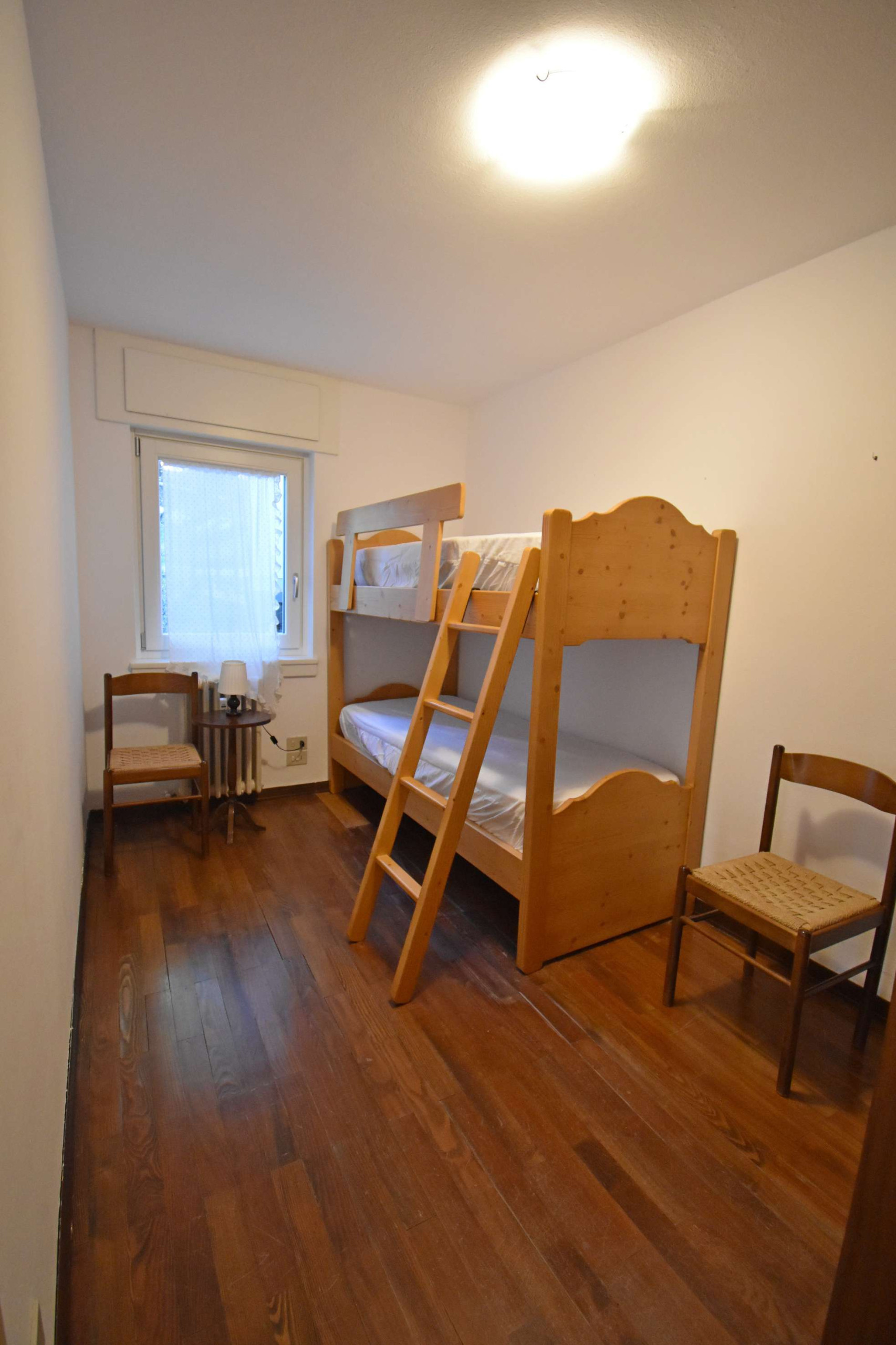 Appartamento situato al primo piano composto da ingresso, camera con letto a castello, camera con letto matrimoniale, bagno completo con finestra e doccia completamente ristrutturato, piccola cucina con finestra, piccolo soggiorno con divano e tavolo da pranzo, ampio e soleggiato balcone. Posto auto in garage e cantina per deposito sci. La posizione è molto tranquilla e comoda per lo sci, uscendo dal condominio a pochi passi si trova la pista che scende dalla malga Zeledria, inoltre a circa 150 mt. si trova il Mini Market di Campo Carlo Magno.