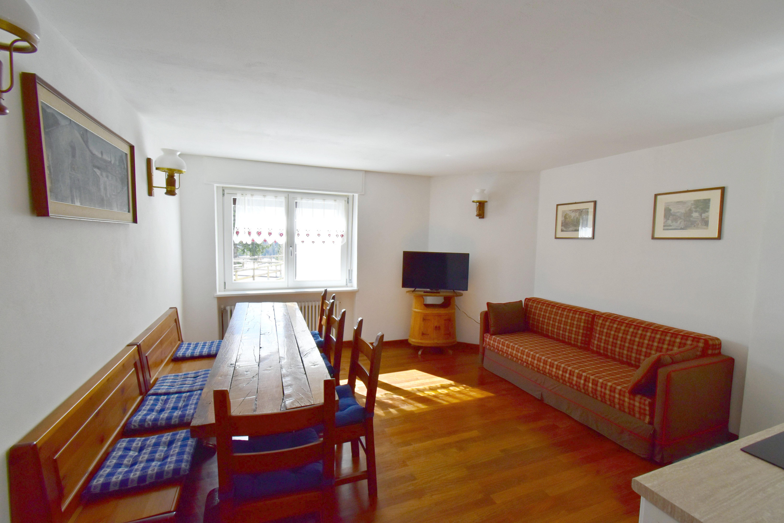 Wohnung für 4/6 Personen, die sich in der Südzone von Madonna di Campiglio befindet, etwa 130 m von der Abfahrt der COLARIN-SEILBAHN entfernt, die direkt zu den Pisten der 5 Seen führt. Sie besteht aus einem Eingang, einem Schlafzimmer mit vollständigem Bad, einem 2. Bad (ohne Dusche), einem Zimmer mit 2 Einzelbetten, einem Wohnzimmer mit Essbereich und Einzelschlafsofa + ausziehbarem Bett, einer Küchenzeile mit Mikrowellenherd und Induktionsplatten.
