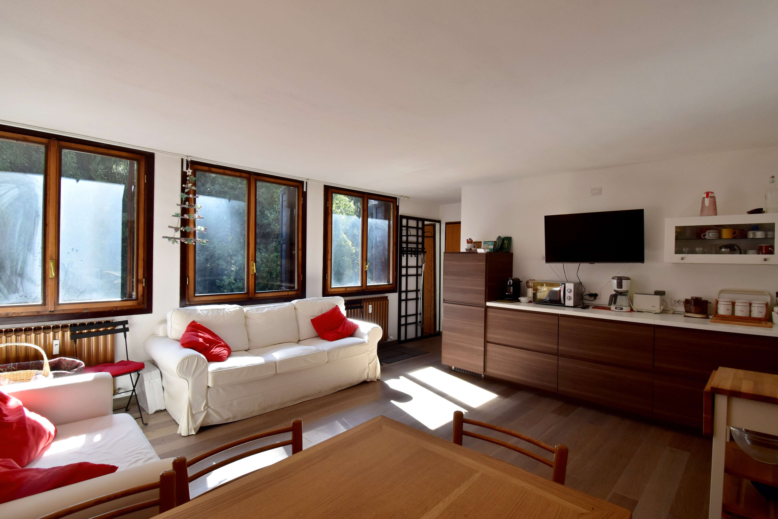Sobald du die Schwelle überschreitest, wirst du von einem lichtdurchfluteten Open-Space-Wohnbereich empfangen, dem Herzstück des Hauses, das für Entspannung und Gemeinschaft konzipiert ist. Der Raum ist funktional unterteilt mit einer praktischen Esszone, einer ausgestatteten Küchenecke und einem gemütlichen Sofabereich.