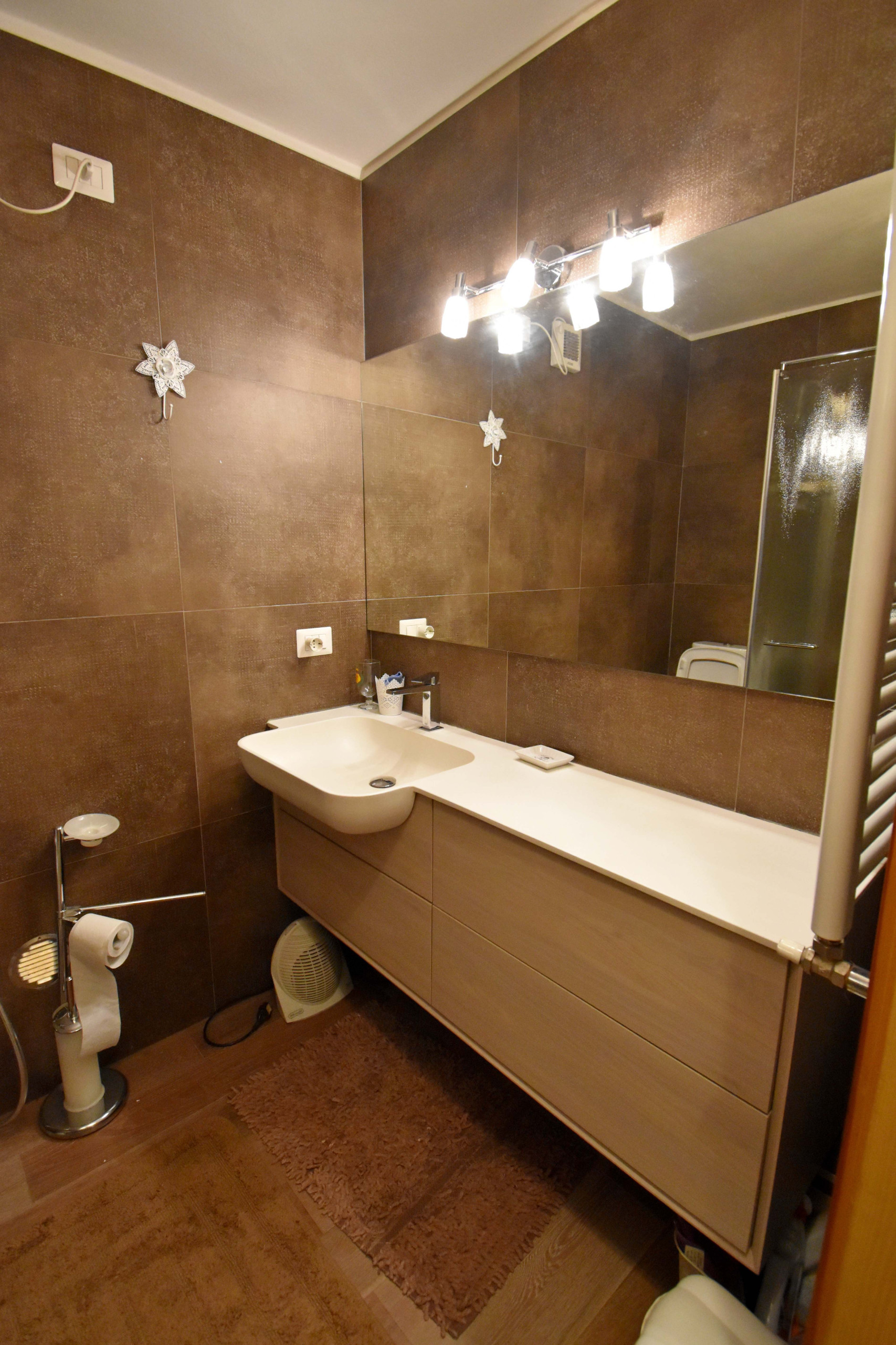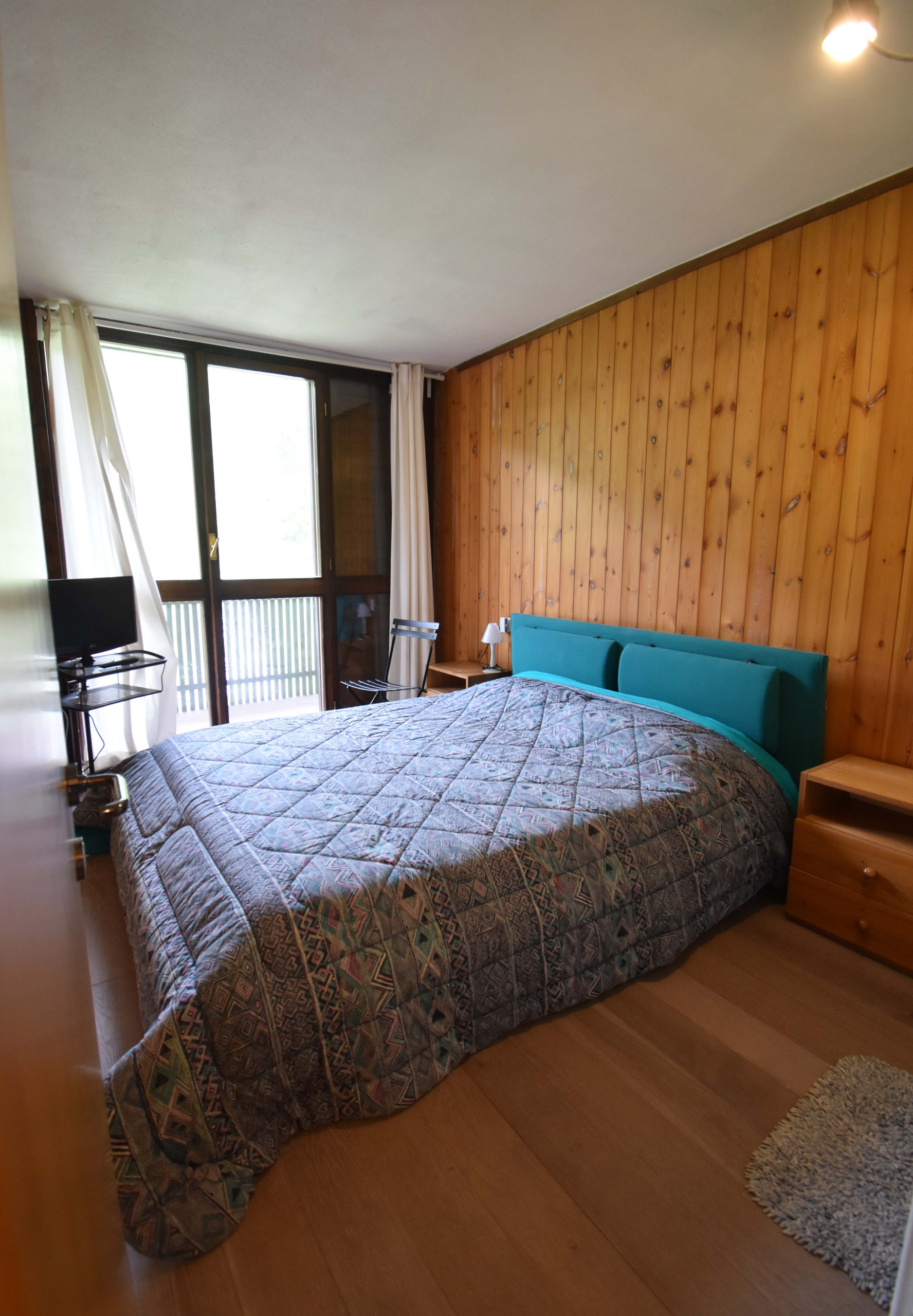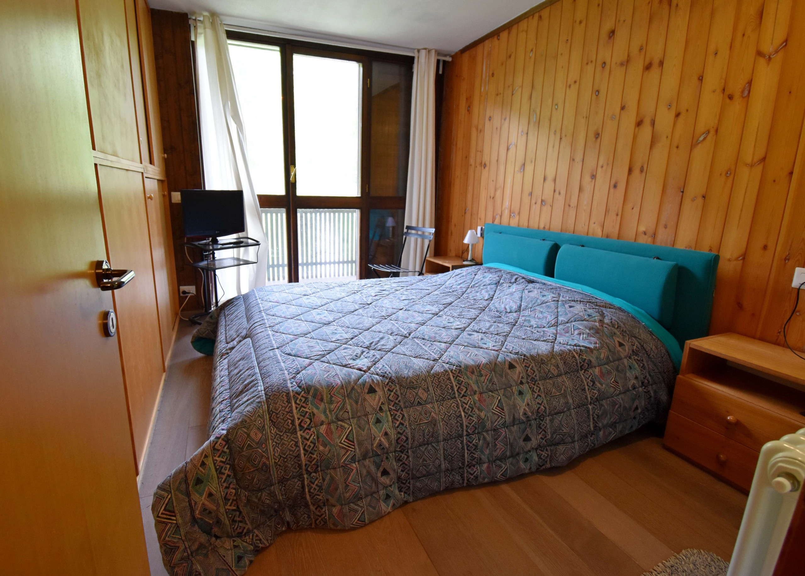 Der Schlafbereich besteht aus zwei gut organisierten Zimmern: ein Elternschlafzimmer und ein zweites Zimmer, ideal für Familien oder Gäste, ausgestattet mit Etagenbetten (insgesamt 4 Schlafplätze). Beide Zimmer öffnen sich auf einen nach Westen ausgerichteten Balkon, der perfekte Ort, um täglich den Sonnenuntergang über den umliegenden Gipfeln und dem großen Gemeinschaftsgarten darunter zu bewundern. Ein modernes Badezimmer mit Dusche komplettiert die Wohnung.