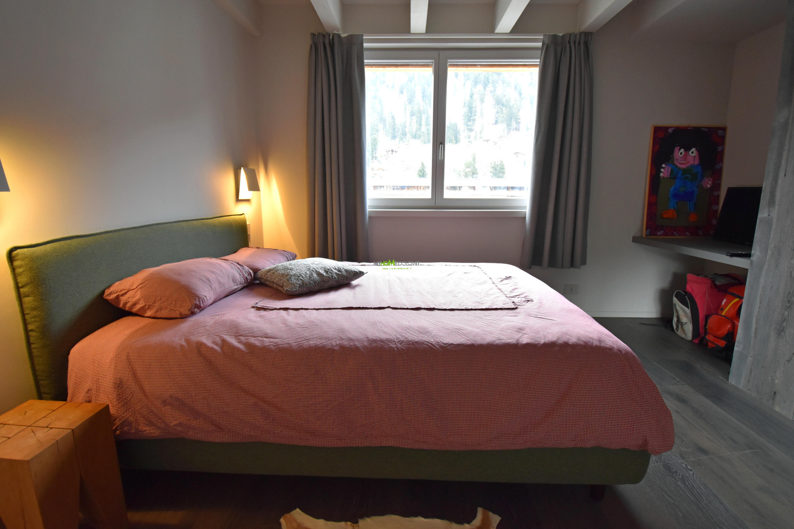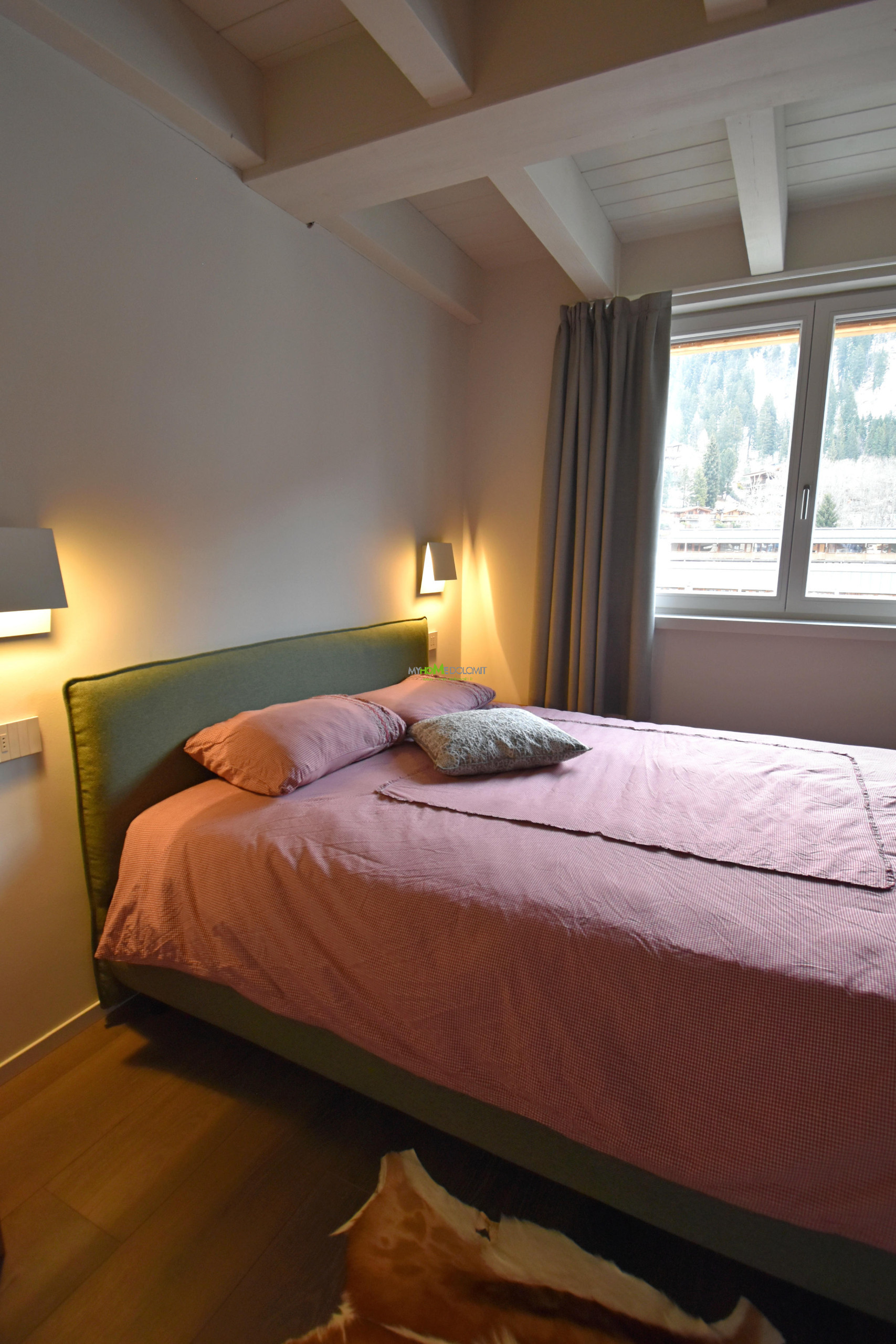 Der Wohnbereich öffnet sich zu einer großen, nach Süden ausgerichteten Panoramaterrasse, von der aus man die Aussicht auf die Berge rund um Madonna di Campiglio genießen kann. Zudem gibt es eine zweite Terrasse, auf die man von einem der beiden Zimmer aus zugreifen kann.