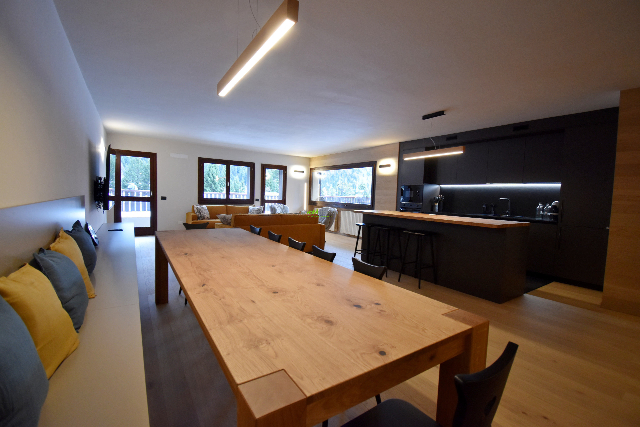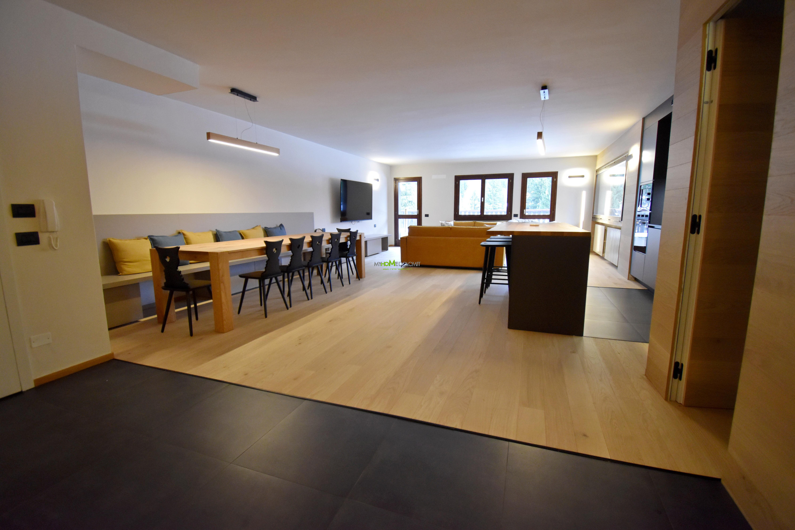 Geräumige Elegante Renovierte Wohnung mit Blick auf die Dolomiten in Madonna di Campiglio. Erleben Sie die Magie der Brenta-Dolomiten in dieser wunderschönen Erdgeschosswohnung, die kürzlich und fein renoviert wurde. Die ideale Basis für Ihren Kurzurlaub in Madonna di Campiglio, die Komfort, Eleganz und eine atemberaubende Panoramalage kombiniert. Die Wohnung verfügt über eine außergewöhnlich praktische Lage, die es Ihnen ermöglicht, den Ort stressfrei zu genießen: Sie befinden sich in der Nähe eines Supermarkts und nur wenige Schritte von renommierten Bars und Restaurants entfernt. Mit einem bequemen Spaziergang entlang der Hauptstraße erreichen Sie den zentralen Platz von Madonna di Campiglio (etwa 700 Meter entfernt). Die Hauptaufstiegsanlagen, einschließlich der Spinale-Gondelbahn und 5 Laghi, sind leicht zugänglich und nur wenige hundert Meter entfernt. Das Herzstück der Wohnung ist das geräumige und lichte Wohnzimmer, das für Geselligkeit konzipiert ist. Die großen Fenster rahmen einen spektakulären und ununterbrochenen Blick auf die Brenta-Dolomiten, ein sich ständig veränderndes Naturgemälde, das zu jeder Tageszeit bewundert werden kann. Der Raum umfasst eine Relaxzone mit bequemen Sofas und einen großzügigen Esstisch, der perfekt ist, um Abendessen und Momente mit Freunden und Familie zu teilen. Die Küchenzeile ist vollständig ausgestattet und wird durch eine praktische Halbinsel aufgewertet, ideal für schnelle Frühstücke oder Aperitifs. Der Schlafbereich (4 Zimmer) präsentiert sich wie folgt: Privatsuite (Zimmer 1), ein exklusives separates Doppelzimmer mit vollständigem Ensuite-Bad und direktem Zugang zum charmanten Dachgarten. Doppelzimmer (Zimmer 2): ein weiteres komfortables Doppelzimmer mit eigenem Ensuite-Bad mit Dusche. Doppelzimmer (Zimmer 3 & 4): zwei einladende und gut ausgestattete Doppelzimmer. Drittes Badezimmer: Ein zusätzliches vollständiges Badezimmer mit Dusche bedient die beiden Doppelzimmer und den Wohnbereich. Dachgarten mit Aussicht: Vom Wohnzimmer und den Zimmern aus haben Sie direkten Zugang zu einem großen privaten Dachgarten, einem wertvollen Außenbereich, in dem Sie sich entspannen, sonnenbaden und die wunderschöne und ruhige Aussicht auf die umliegenden Berge in vollen Zügen genießen können. Die kürzlich renovierte Wohnung ist perfekt für große Familien oder Freundesgruppen (bis zu 8 Personen), die einen hochwertigen Aufenthalt mit allen Annehmlichkeiten und einer privilegierten Lage wünschen, um das alpine Erlebnis von Madonna di Campiglio optimal zu genießen.
