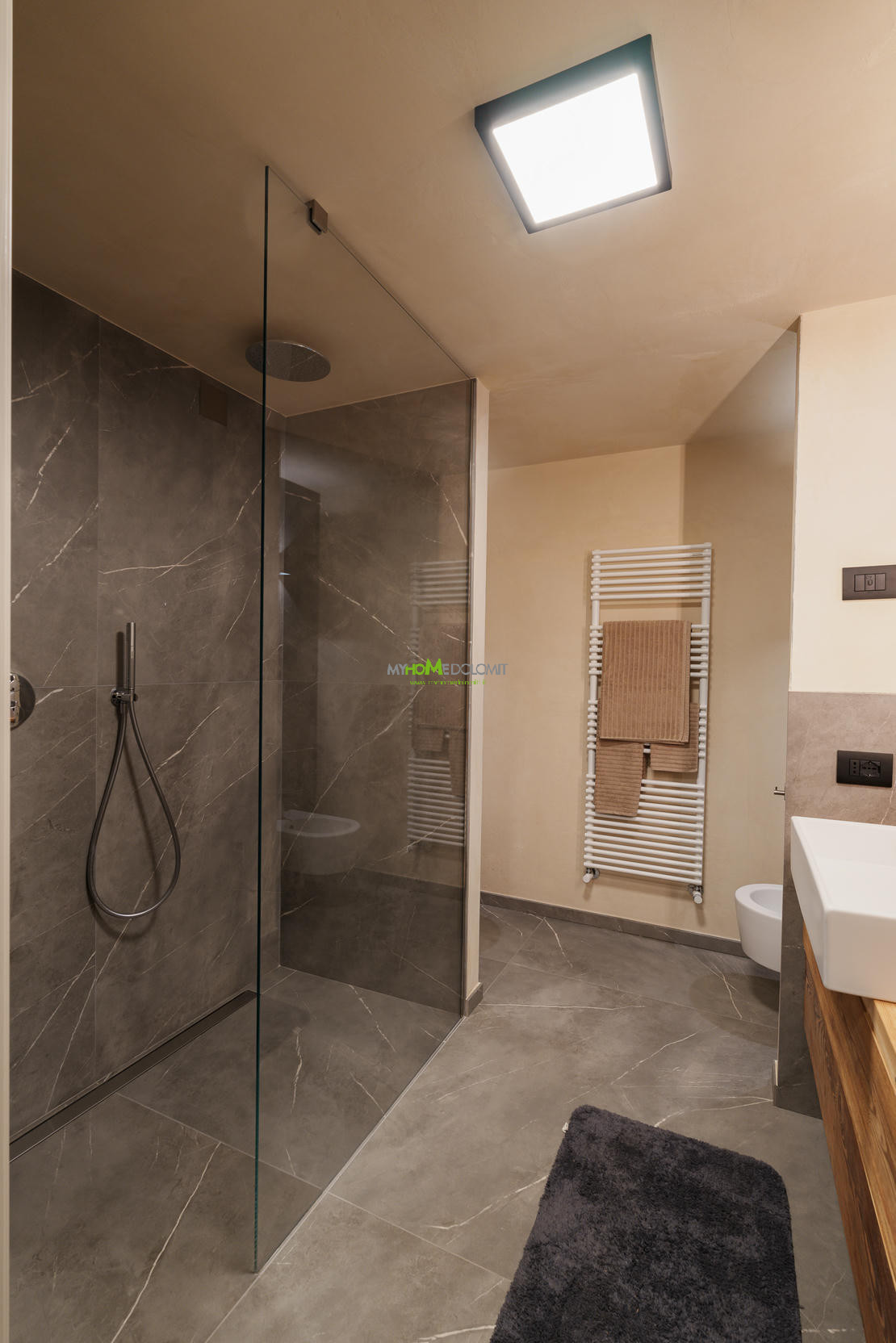 Der Schlafbereich ist darauf ausgelegt, maximale Privatsphäre und Wohlbefinden zu gewährleisten: Im Obergeschoss befinden sich eine Master-Suite mit großer Panoramafenster, ein zweites Doppelzimmer, ein Einzelzimmer und zwei Badezimmer; das Erdgeschoss beherbergt hingegen ein kleines Schlafzimmer mit Etagenbett und eigenem Bad. ideal für die Jüngsten.