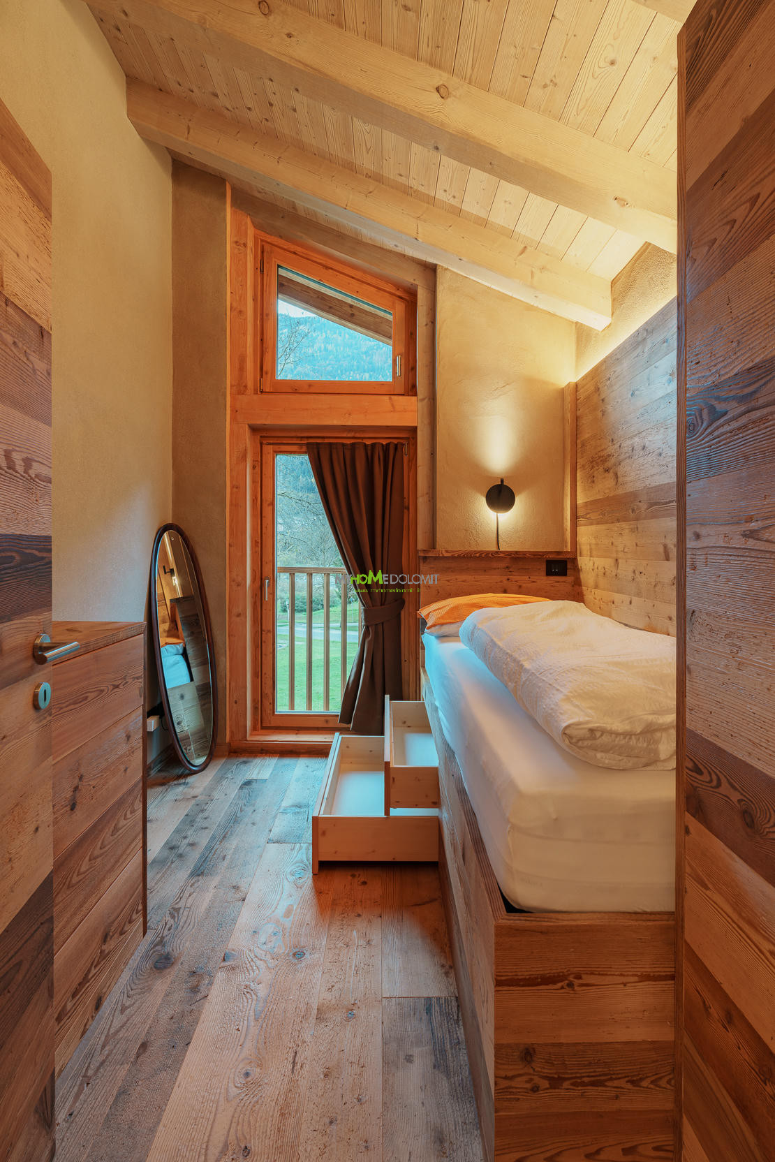 Das Erlebnis erstreckt sich natürlich auch nach draußen, wo der große Garten zu einem privaten SPA unter freiem Himmel wird: Sie können sich in der Holzsauna erholen, im Solarium entspannen oder im Pavillon mit Grill und Ofen im Freien speisen. Trotz der dominierenden und privaten Lage, ist die Lodge nur wenige Minuten von den wichtigsten Dienstleistungen und zahlreichen sportlichen Aktivitäten wie Schwimmbad, Tennis, Paddle und einem malerischen Radweg entfernt, was sie zum idealen Ausgangspunkt für Familien macht, Sportler und digitale Nomaden auf der Suche nach Schönheit und Authentizität.