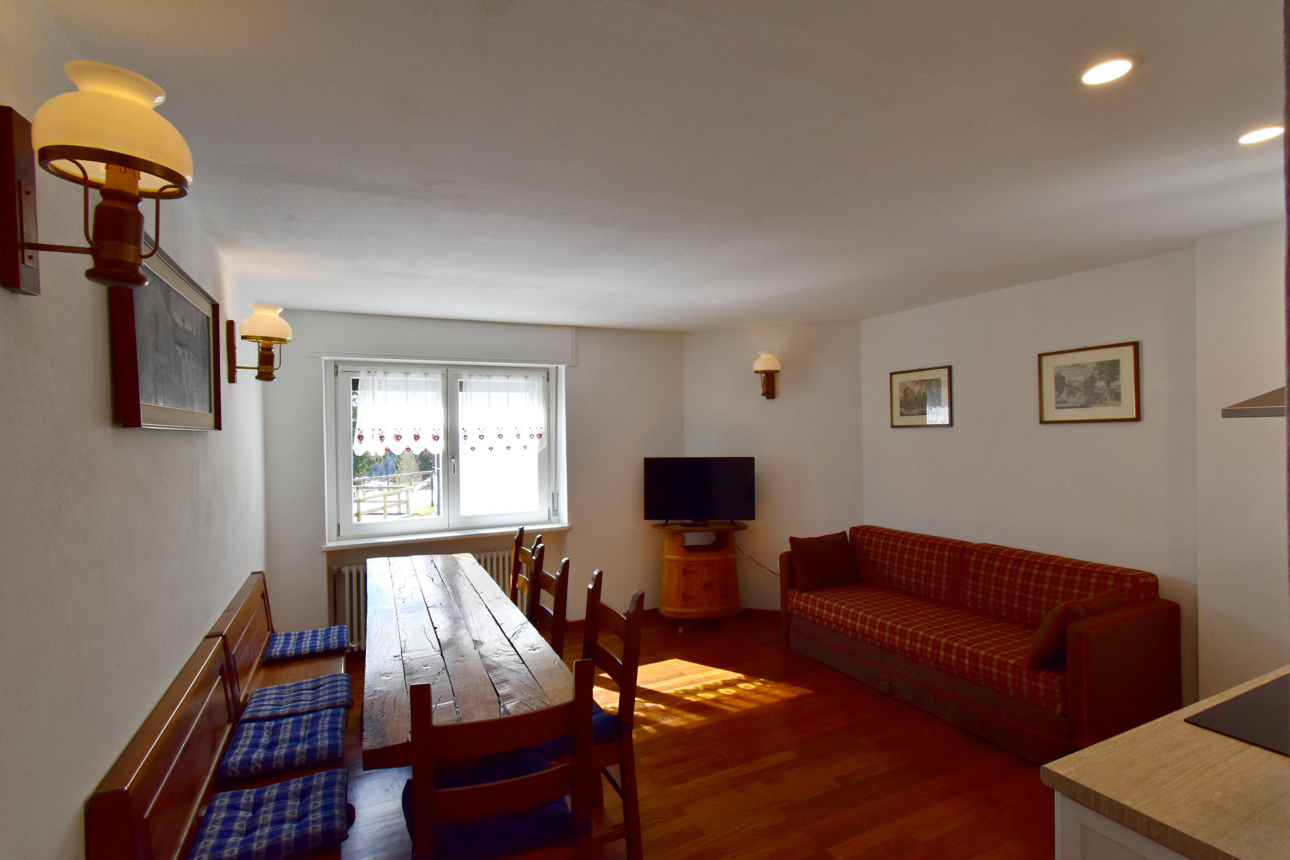 Apartment for 4/6 people located in the southern area of Madonna di Campiglio, approximately 130 metres from the COLARIN cable car departure, which leads directly to the 5 Laghi ski slopes. It comprises an entrance, a double bedroom with a complete bathroom, a second bathroom (without a shower), a room with two single beds, a living room with a dining area and a single sofa bed + pull-out bed, a kitchenette with a microwave oven and induction hobs.
