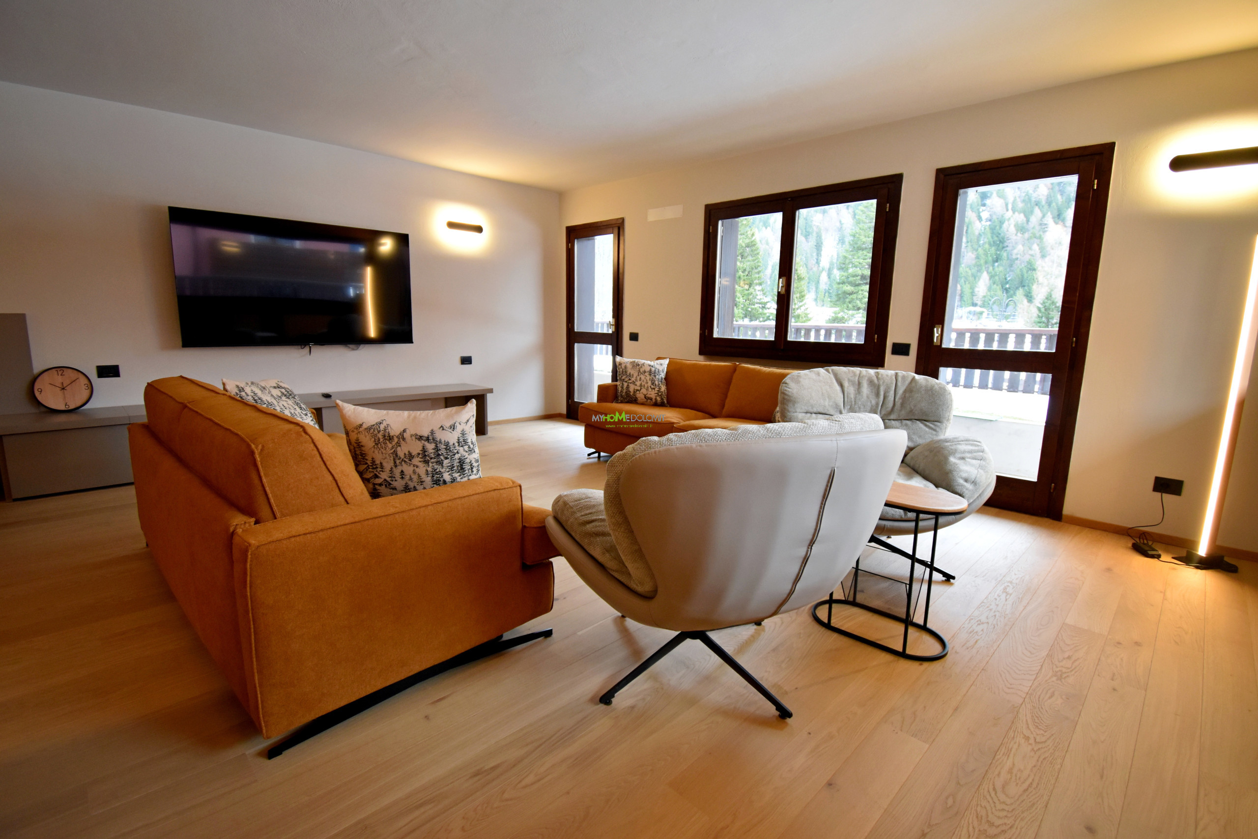 A spacious and elegant renovated apartment with Dolomites view in Madonna di Campiglio. Experience the magic of the Brenta Dolomites in this splendid first-floor apartment, recently and finely renovated. The ideal base for your short holiday in Madonna di Campiglio, combining comfort, elegance, and a breathtaking panoramic location. The apartment boasts an exceptionally convenient location, allowing you to enjoy the resort without stress. You are situated above a supermarket and just a few steps from renowned bars and restaurants, with a comfortable flat walk along the main avenue, which leads to the central square of Madonna di Campiglio (approximately 700 metres away). The main ski lifts, including the Spinale and 5 Laghi cable cars, are easily accessible and just a few hundred metres away. The heart of the apartment is the spacious and bright living room, designed for conviviality. The large windows frame a spectacular and uninterrupted view of the Brenta Dolomites, a natural picture in constant evolution to be admired at any time of the day. The room features a relaxation area with comfortable sofas and a spacious dining table, perfect for sharing meals and moments with friends and family. The kitchenette is fully equipped and enhanced by a practical peninsula, ideal for quick breakfasts or aperitifs. The Sleeping Area (4 Rooms) features: Private Suite (Room 1), an exclusive separate double room, with a complete en-suite bathroom and direct access to the suggestive roof garden. Double Room (Room 2): another comfortable double room with its own en-suite shower bathroom. Double Rooms (Rooms 3 & 4): two welcoming and well-finished double rooms. Third Bathroom: an additional complete shower bathroom serves the two double rooms and the living area. Roof Garden with View: from the living room and bedrooms, you can directly access a large private roof garden, an outdoor space of great value where you can relax, sunbathe, and fully enjoy the splendid and tranquil view of the surrounding mountains. The recently renovated apartment is perfect for large families or groups of friends (up to 8 people) who desire a high-quality stay, with all services and a privileged location to best experience the alpine experience of Madonna di Campiglio.
