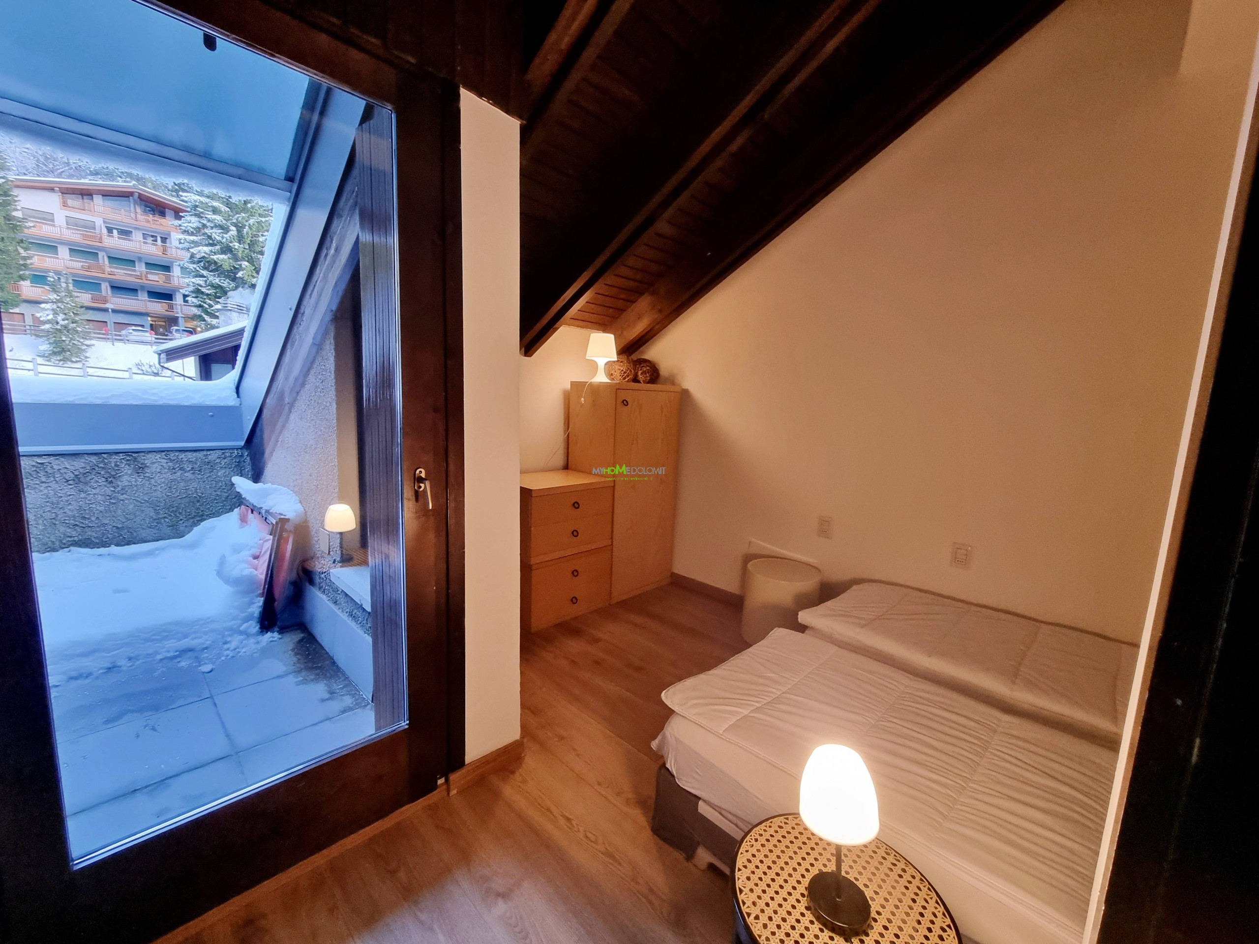 Spacious Two-Level Apartment: This welcoming and spacious two-level apartment is the perfect base for large families or groups. Furnished simply and functionally, it offers privacy and independence with its own entrance on the first floor. Comfortable Interiors & Scenic Views Step inside to a bright and airy living area, the heart of the home. The expansive lounge features a comfortable sofa area and large windows that open onto a balcony, offering a charming view of the garden, fir trees, and the lake. You'll also find a well-equipped kitchenette with a small dining nook. The first sleeping area on this floor includes a cozy double bedroom, a single room, and a full bathroom with a shower. An internal staircase leads to the upper attic floor, which houses the second sleeping area. This level offers a second attic bathroom with a bathtub, a room with two single beds, and an additional room featuring a double bed set flush with the wall—perfect for maximizing space. The apartment boasts a truly strategic location. Nestled in a quiet, leafy green area, it allows you to forget your car for the entire holiday. Skiers will love being just a few steps from the Spinale Cable Car, giving you immediate access to the slopes. For downtime, the charming Lake Campiglio and the town center—with all its services, restaurants, boutiques, and shops—are easily and conveniently accessible on foot. This is the ideal choice for a holiday focused on sport and relaxation in the heart of the Brenta Dolomites: tranquility and slopes are right at your fingertips!