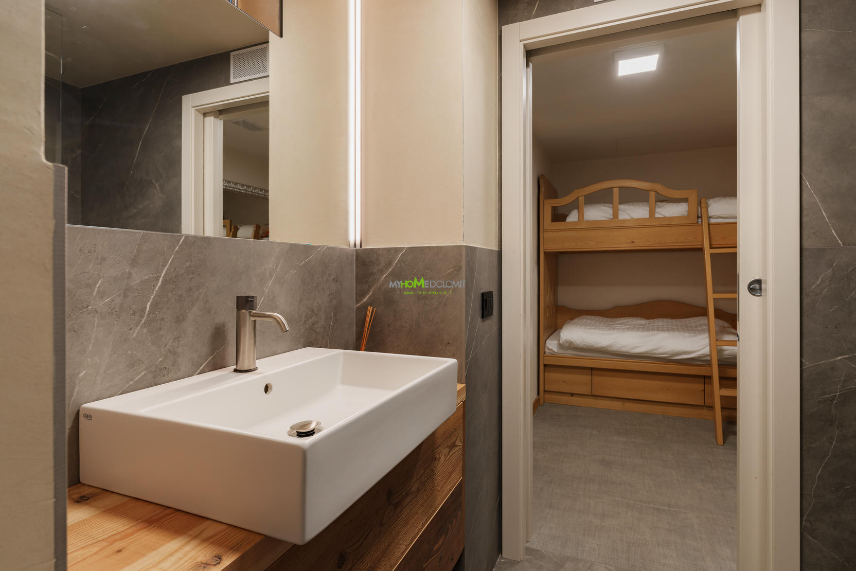 The sleeping area is designed to ensure maximum privacy and well-being: upstairs is a master suite with a large panoramic window, a double suite, a single bedroom, and two bathrooms; the ground floor houses a bedroom with a bunk bed and a private bathroom, ideal for younger guests.